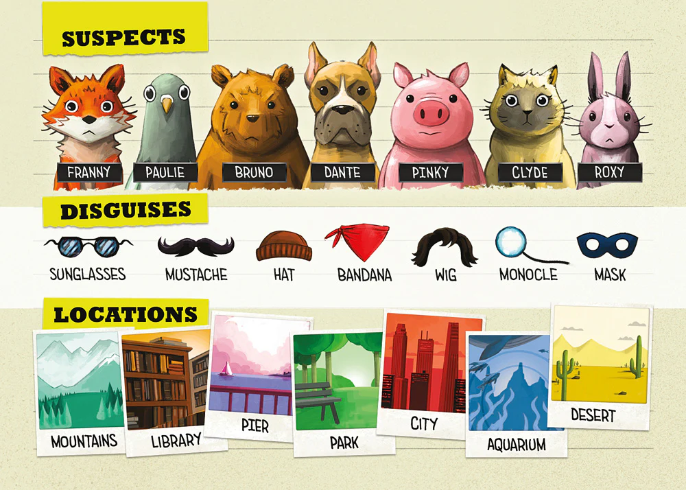 Calling all Ducktectives! Put your sleuthing skills to the test to correctly figure out the animal, disguise, and location on the hidden card. Do the clues point to Paulie the Pigeon wearing a Mustache in the Park? Or maybe it's Pinky the Pig in a Wig at the Pier! Reinforces logic and deduction skills and plays in about 15 minutes. Can you quack the case? For 2-4 players.