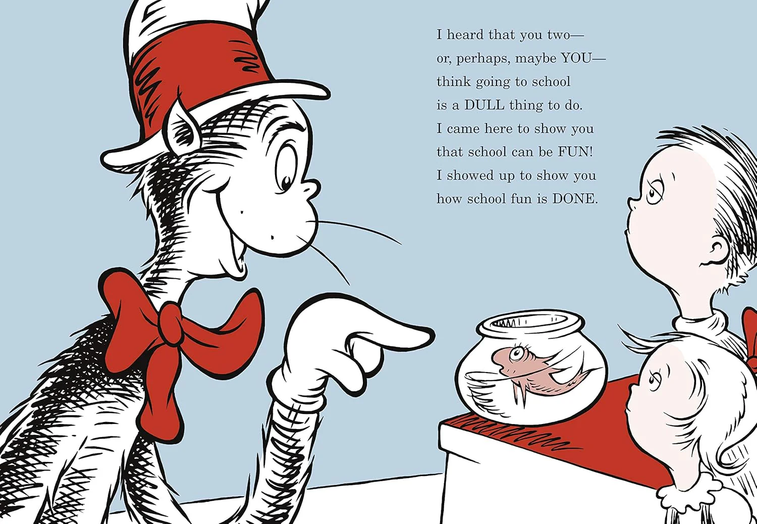 When the Cat hears that Sally and her brother of the classic The Cat in the Hat think school is dull, he arrives at their classroom—along with Little Cats A, B, and C from The Cat in the Hat Comes Back—to demonstrate how school fun should be done! Among the changes he'd make? Adding two-headed class pets; replacing show-and-tell with smell-and-tell; planting book-blooming seeds (growing rooms full of books); and adding such nontraditional materials as mops and plungers to art class! An ideal choice for children entering school for the first time, this easy reader is bound to cause lots of giggles—helping to ease any back-to-school anxiety!