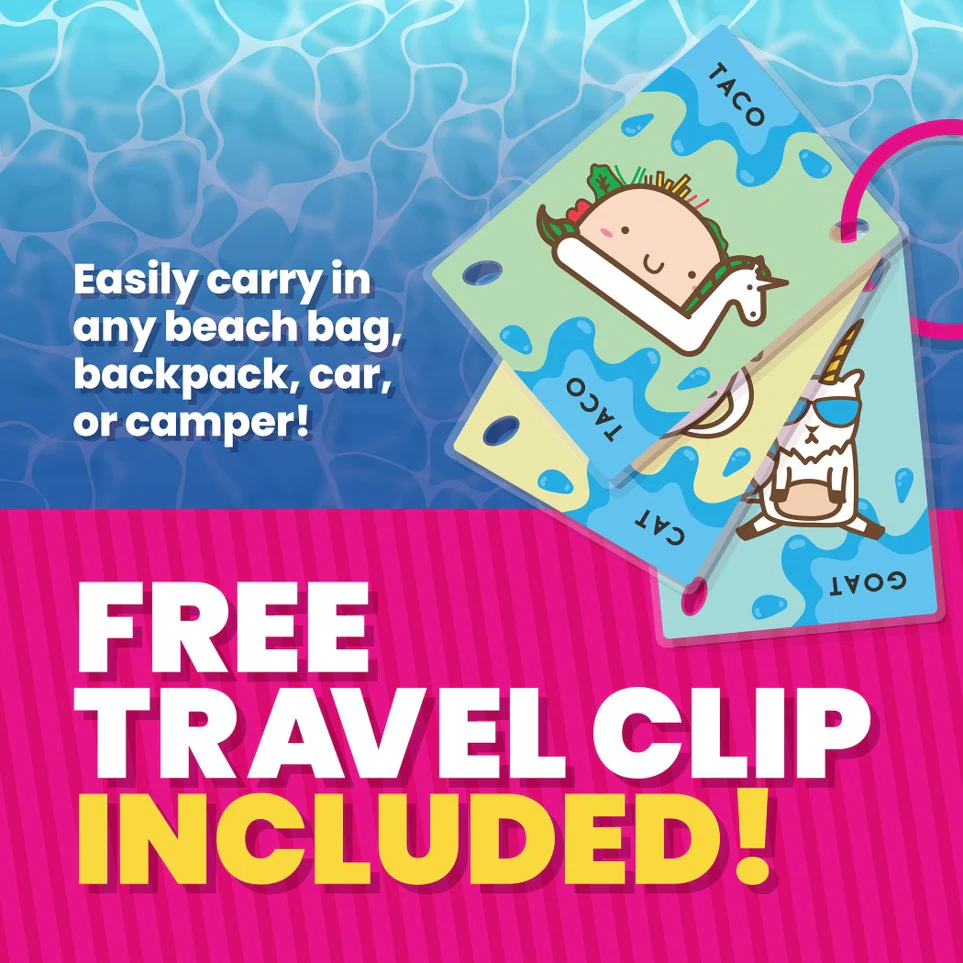 Bring the fun wherever you go with the best-selling card game, Taco Cat Goat Cheese Pizza, now featuring waterproof cards!